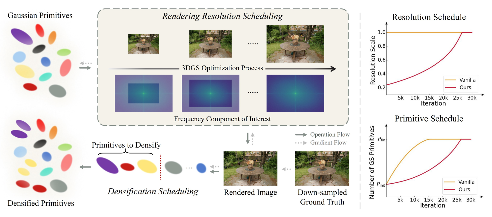 レンダリング解像度が段階的に上がっていくのと同期して、Gaussianプリミティブの数も適切に増加させる仕組みです。過剰なプリミティブの生成は計算コストを増大させるだけでなく、画質のわずかな向上しかもたらしません。このスケジューラは、プリミティブの成長を抑えつつ、レンダリング解像度とのバランスを取りながら、効率的にシーンを表現できる最小限のプリミティブ数を維持しようとします。