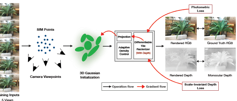 3DGSの学習プロセスにおいて、この推定された深度情報と、3DGS自身がレンダリングする深度マップを比較し、その差を損失として加えます。これにより、モデルはより正確な3D形状を学習するようになります。