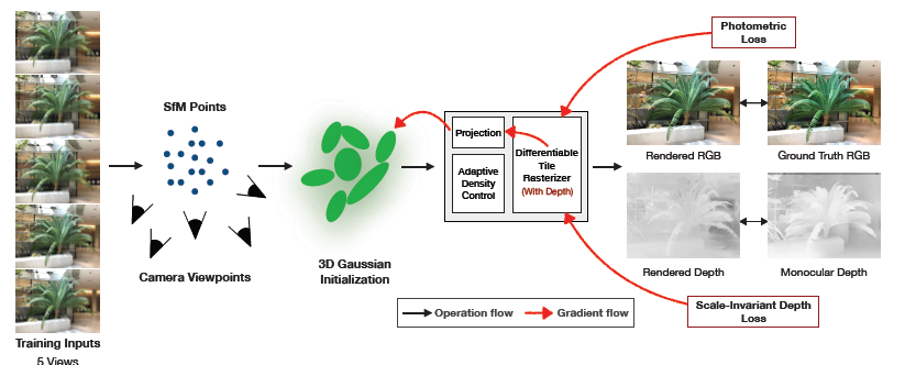研究チームは、このFew-shot問題に対して「Depth Aware 3D Gaussian Splatting」という新しい手法を提案しています。これは、深度情報(Depth)をうまく活用することで、少ない入力画像からでもシーンの3D形状を正確に学習し、高品質な新視点画像を生成することを可能にします。