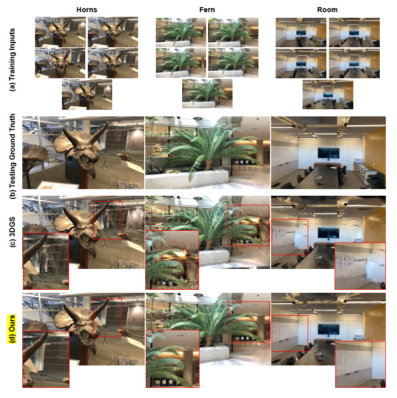 上の画像は、提案手法でレンダリングされた「Fern」シーンの新視点画像です。少ない入力ビューにもかかわらず、非常にリアルで詳細なシーンが再現されているのがわかります。特に、オリジナルの3DGSと比較すると、その品質の差は歴然です。
