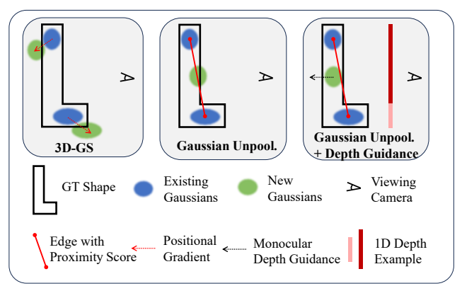 FSGSの核となる技術の一つが、「Proximity-guided Gaussian Unpooling」です。これは、既存のGaussianが少ない場合に、その密度を効果的に高めるための戦略です。