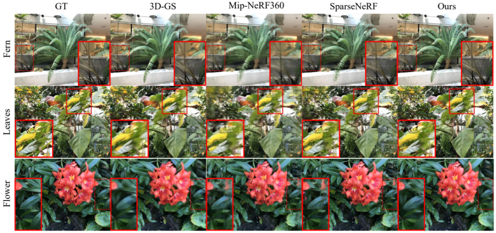 上の比較画像を見ると、NeRFベースの先行研究が複雑なジオメトリを持つ領域でぼやけた結果や不自然なアーティファクトを生じているのに対し、FSGSはより鮮明で詳細なテクスチャや構造を再構築していることがわかります。