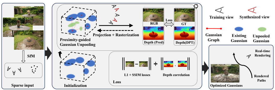 FSGSの核となる技術の一つが、「Proximity-guided Gaussian Unpooling」です。これは、既存のGaussianが少ない場合に、その密度を効果的に高めるための戦略です。