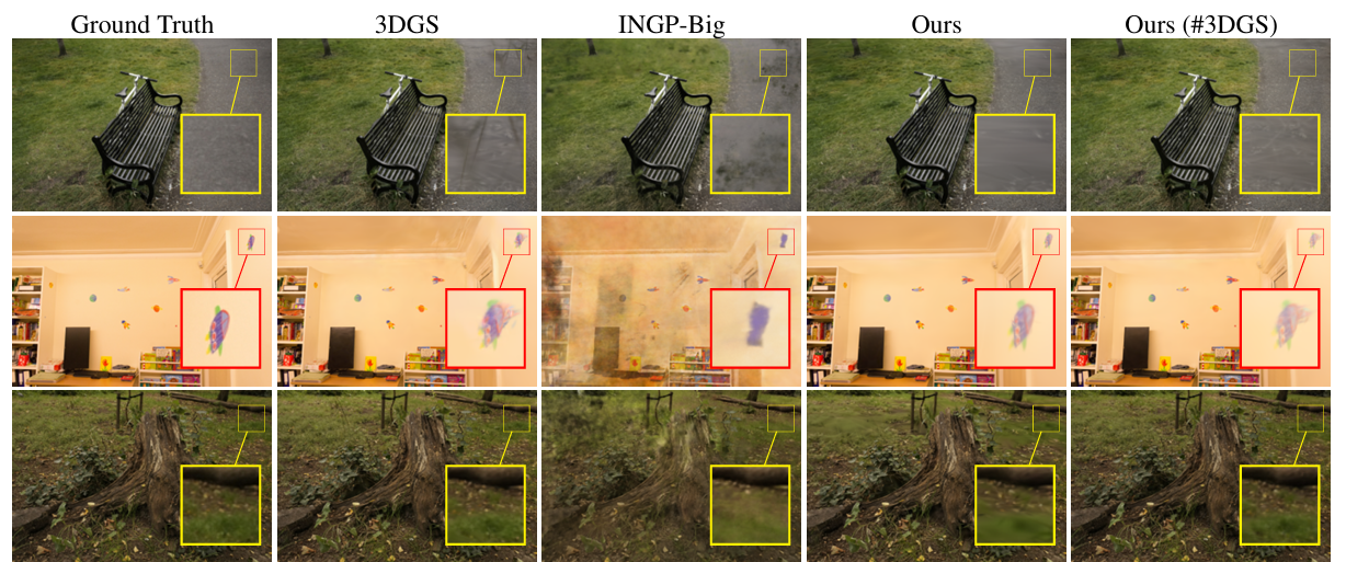 モデルサイズとトレーニング時間を従来の3DGSに比べて4〜5倍削減しながら、PSNR、SSIM、LPIPSといった品質指標において、競争力のある、あるいはそれを上回る品質を達成しています。