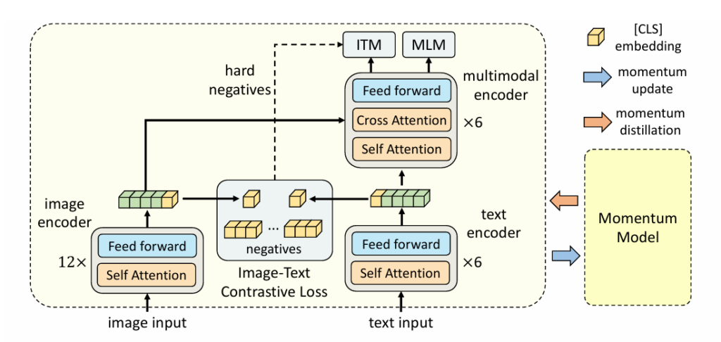 このシンプルな構成でありながら、前述のITC、MLM、ITM、そしてMomentum Distillationという洗練された学習目標を組み合わせることで、高い性能を発揮します。