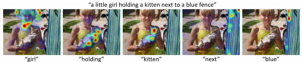 以下の画像は、ある画像に対するALBEFの視覚化の例です。例えば、「a little girl holding a kitten next to a blue fence」というテキストがあったとします。