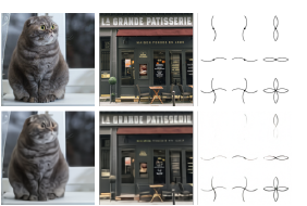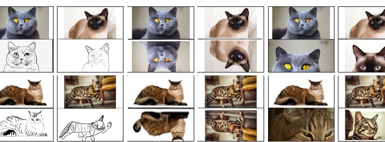 この画像は、上段の猫の写真を元に、「全く同じ猫が下段にスケッチとして描かれている」という指示で、下段にスケッチ風の画像を生成した例です。このように、テキスト指示だけで画像のスタイルを変更したり、属性を調整したりする能力は、画像編集の新たな可能性を広げます。