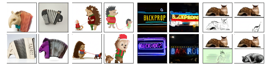 上の画像のように、オリジナルの画像(上段)は、dVAEによって再構成された画像(下段)と比較しても、その大まかな構造や主要な要素が維持されていることが分かります。
