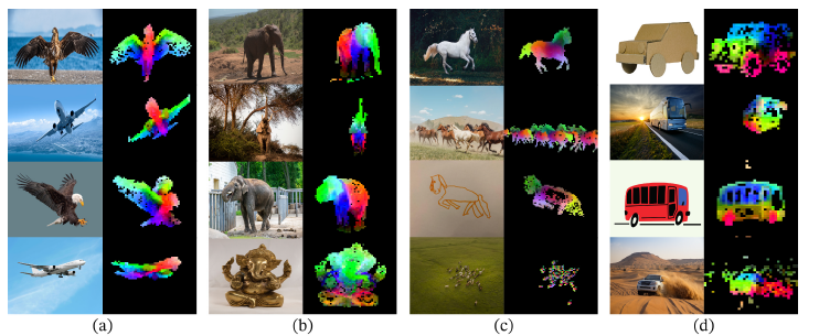背景が除去され、オブジェクトの主要な部分が分離され、さらに同じオブジェクトの異なるポーズやスタイル、さらには異なるオブジェクト間でも意味的に対応するパーツが同じ色で表現されていることが分かります。これは、DINOv2がオブジェクトの「部分」を理解し、その特徴が非常に汎用的であることを示しています。