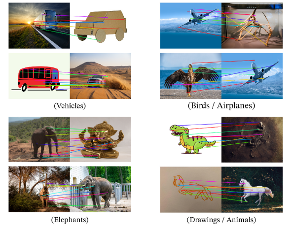 この図は、異なる画像間でパッチレベルの特徴をマッチングさせた結果を示しています。DINOv2は、航空機と鳥の翼、象の異なるポーズ、あるいは車の絵と実際の車のように、意味的に類似した領域を正確に対応付けることができます。これは、DINOv2の学習した特徴がスタイルやポーズの変化に強く、高度な意味的理解を持っていることを視覚的に示しており、モデルの優れた汎化能力を強調しています。