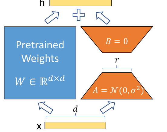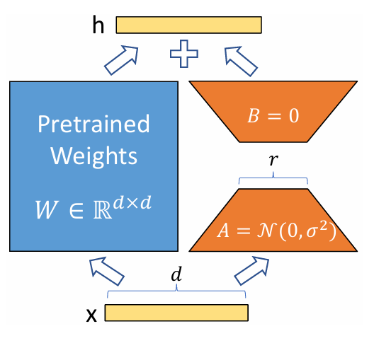 学習開始時には、A はランダムな正規分布で、B はゼロで初期化されます。これにより、ΔW = BA は学習開始時にゼロになり、モデルは事前学習済みの性能からスタートします。学習中には、この B と A のパラメータのみを最適化するため、全パラメータを更新するファインチューニングと比べて、計算コストを大幅に削減できるのです。