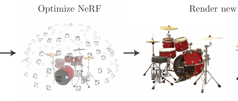 上の画像はNeRFの学習データとなるドラムセットとその撮影カメラ位置の例で、様々な視点から撮影された写真が学習に用いられます。
