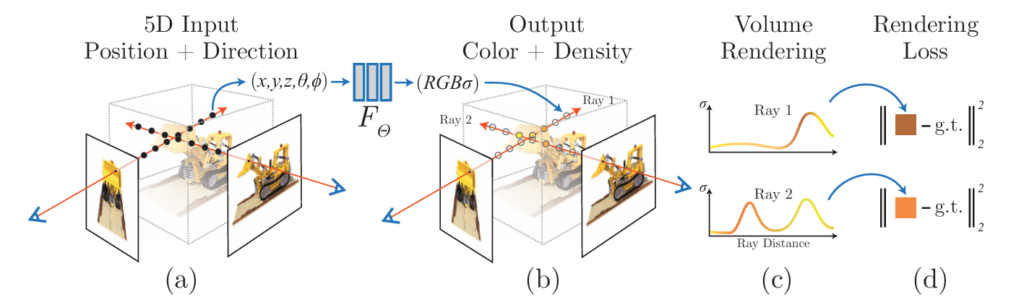 NeRFのレンダリングおよび学習パイプラインの概要。カメラレイに沿って5D座標をサンプリングし、MLPで色と密度を予測、ボリュームレンダリングで画像を合成し、その誤差を元にMLPを最適化します。